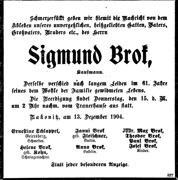 | Children: | Judr Max Brok ( 5 June 1878- 1941, Lodz, Poland) |